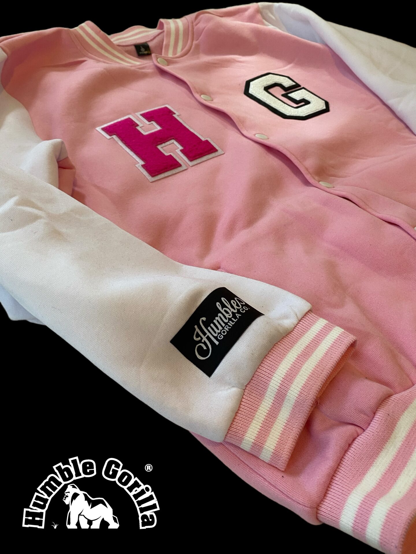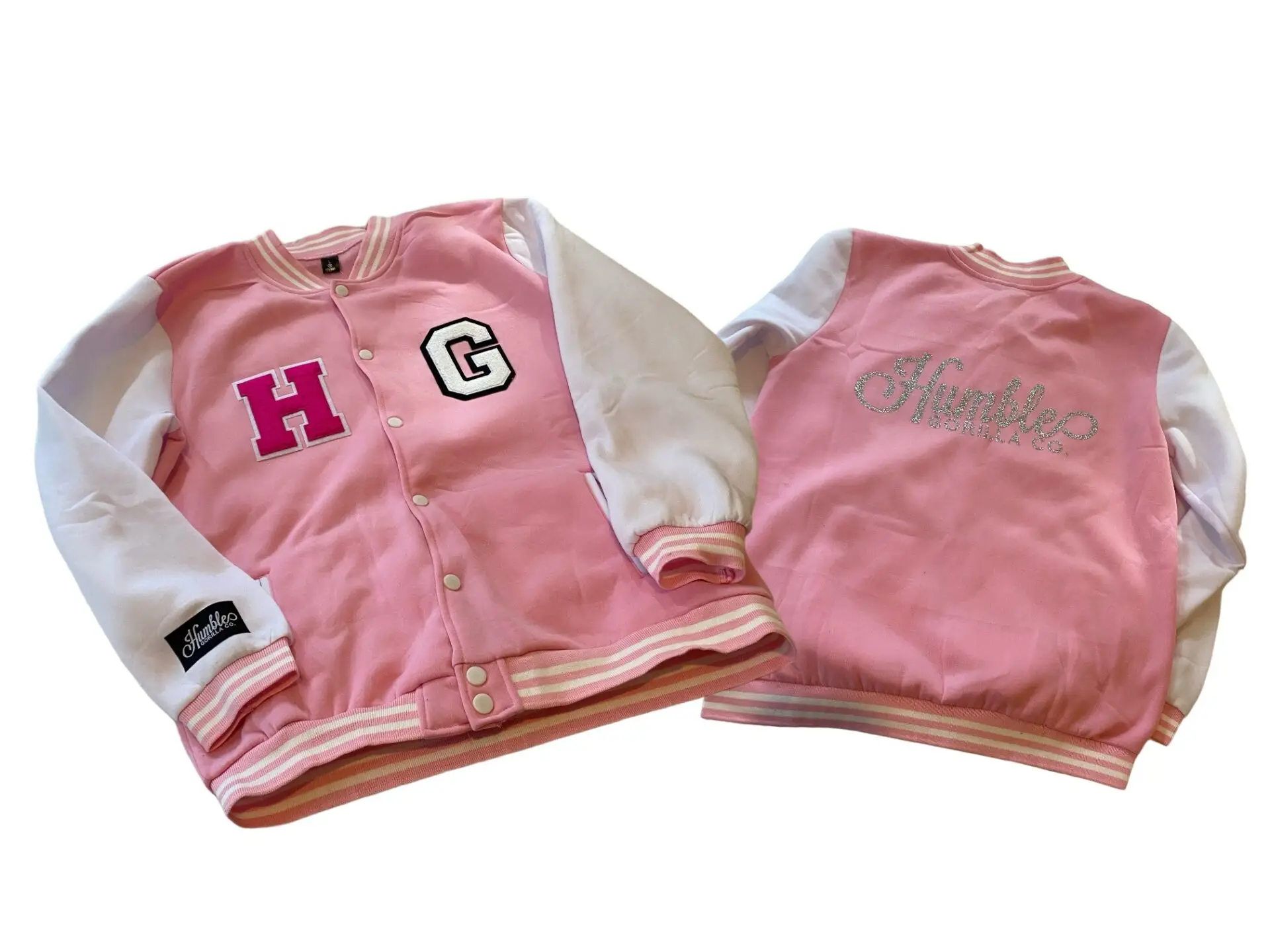 Humble Gorilla Skating rink Jacket in Pink and White with chenille embroidery patches and glitter print on the back. 🔥🔥🔥